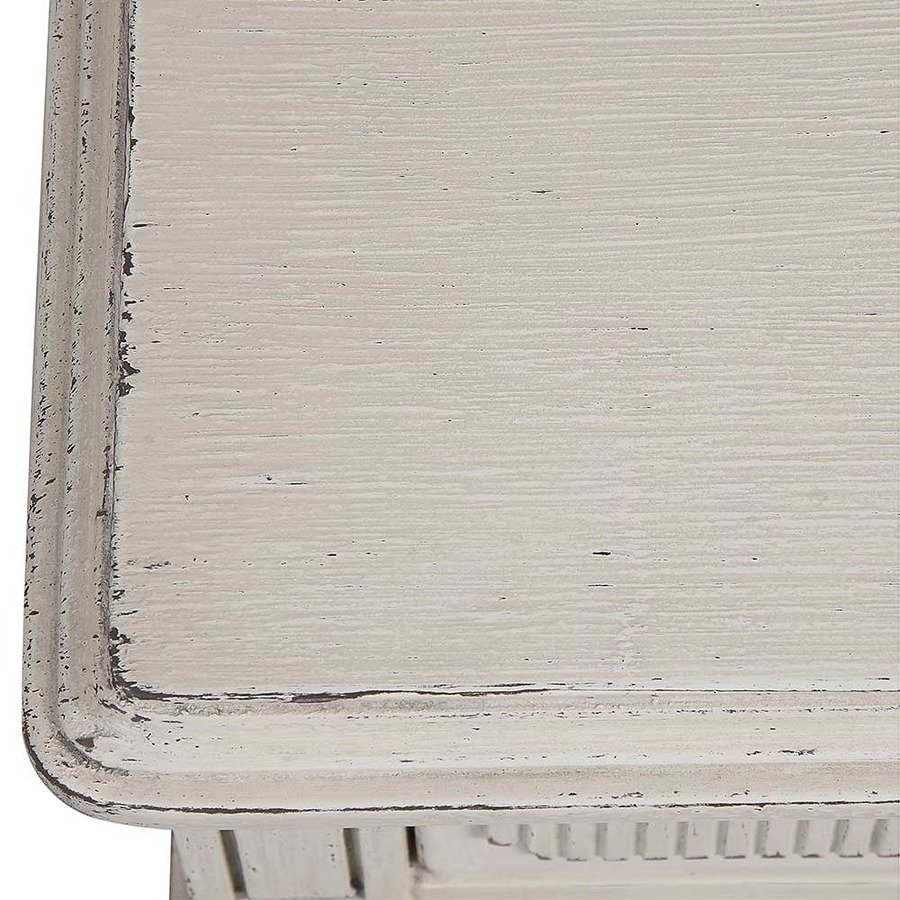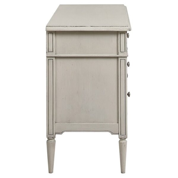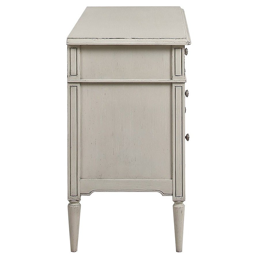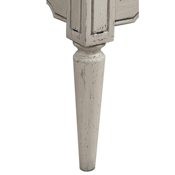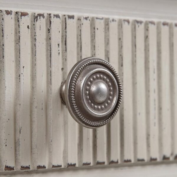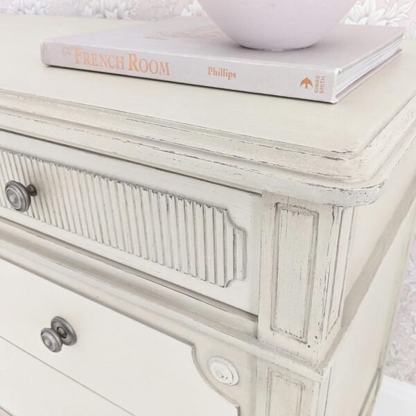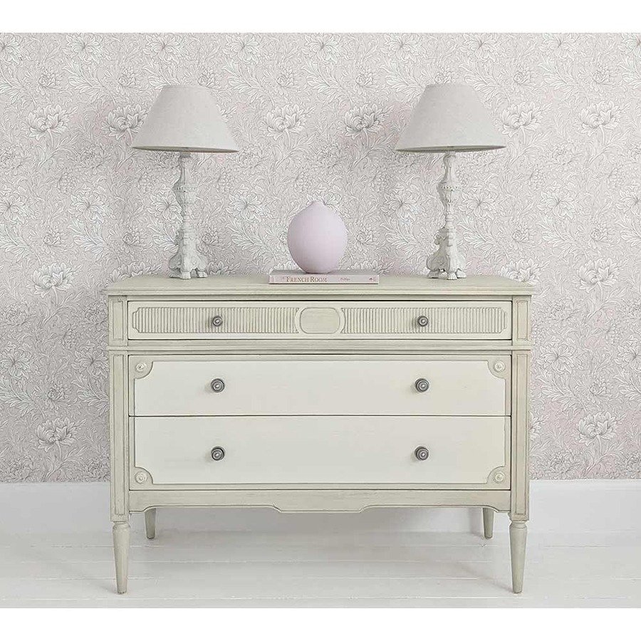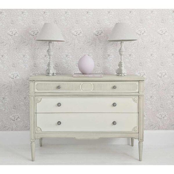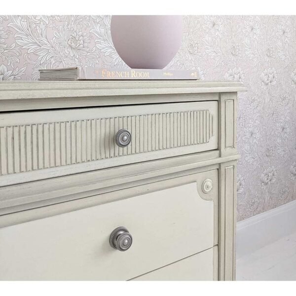 The Avenue Montaigne Chest of Drawers is beautifully painted in a finish of mildly distressed French fawn and gentle antique stone. For colour reference, the most similar colours on the Farrow & Ball colour chart would Slipper Satin and Stony Ground. It features fluted detailing on the top drawer, intentionally a shallower depth to allow easy access to everyday items such as intimates and hosiery. Two further drawers feature scalloped inset corner detailing, providing contrast to the fluted drawer front. Finally, tapered legs lend a feminine edge to this chest of drawers. The three drawers each have recycled metal handles.
