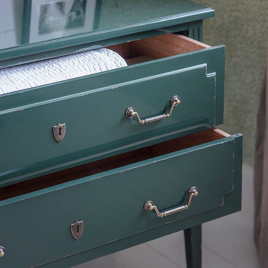 Designed with two deep full-length drawers with decorative, antique-style keyhole locks, it is pleasingly nostalgic and evokes a truly timeless and classic aesthetic.