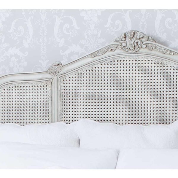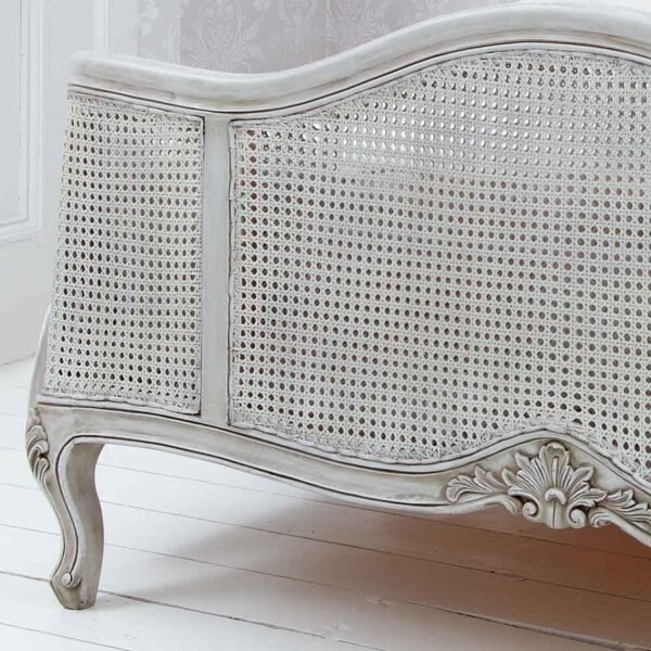 We love the vintage elegance of this hand carved mahogany French rattan bed! Painted with a lightly distressed pale grey finish and fitted with slightly paler grey rattan, paired with crisp bed linen this French bed is both luxurious and practical. The very gently curved footboard gives a sense of containment to the bed, which makes it a true statement piece.