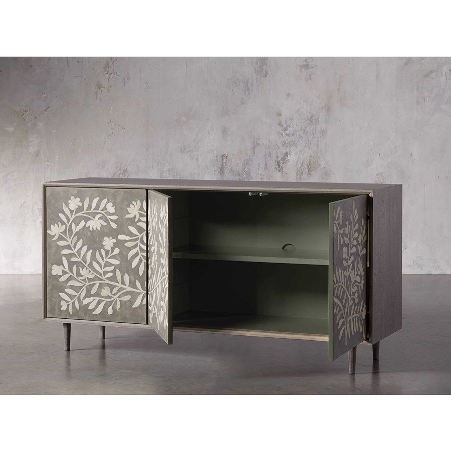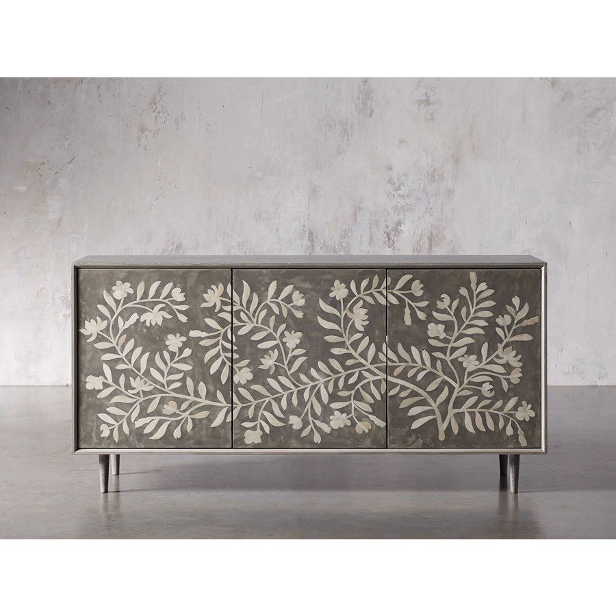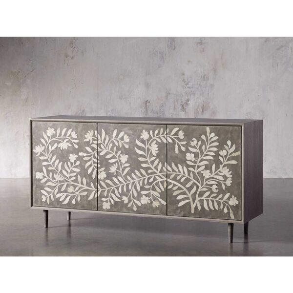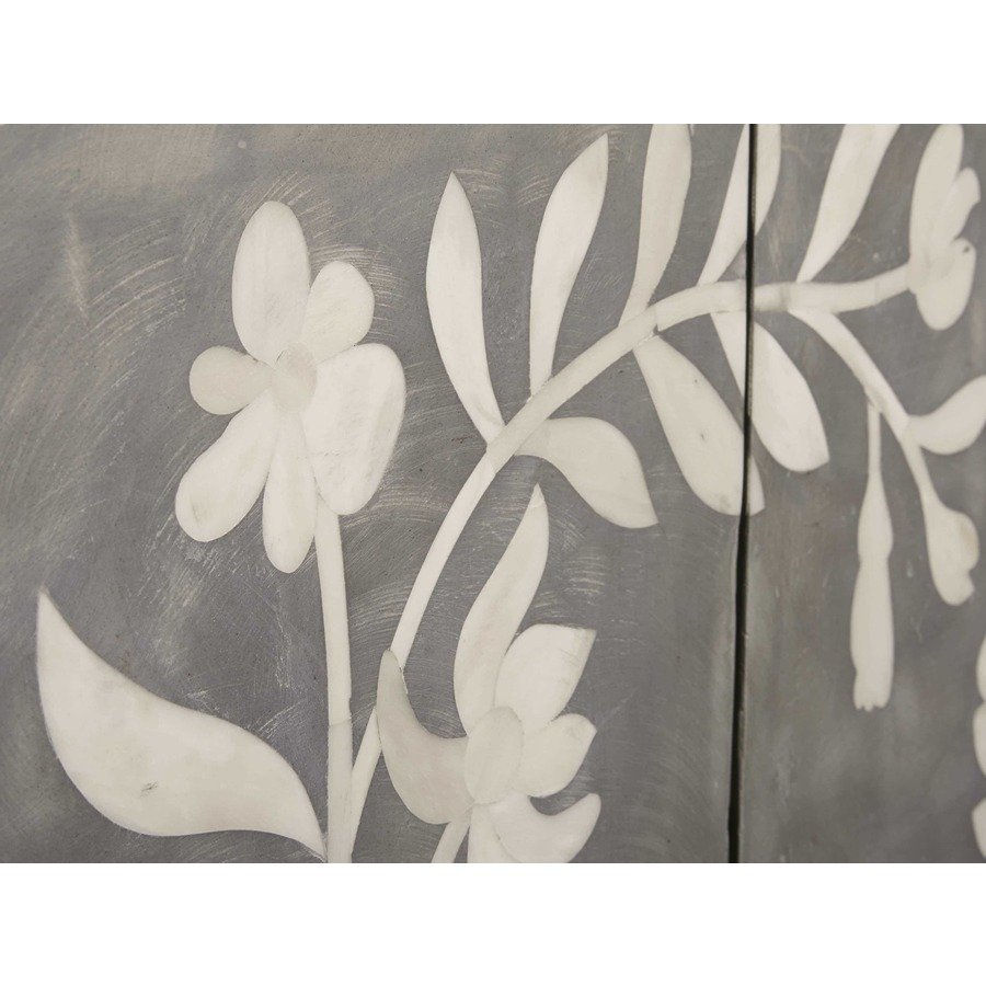 passed down from generation to generation. These modern, handcrafted case pieces feature mosaic floral motifs—hand-drawn by our designer—reminiscent of the naturally elegant jasmine found growing amongst . Each cabinet door takes ten days to complete, as artisans select and shape each bone by hand. As our artisans are non-violent and strict vegetarians, our bone is humanely sourced from naturally deceased water buffalo that roam the streets and countryside of Rajasthan.